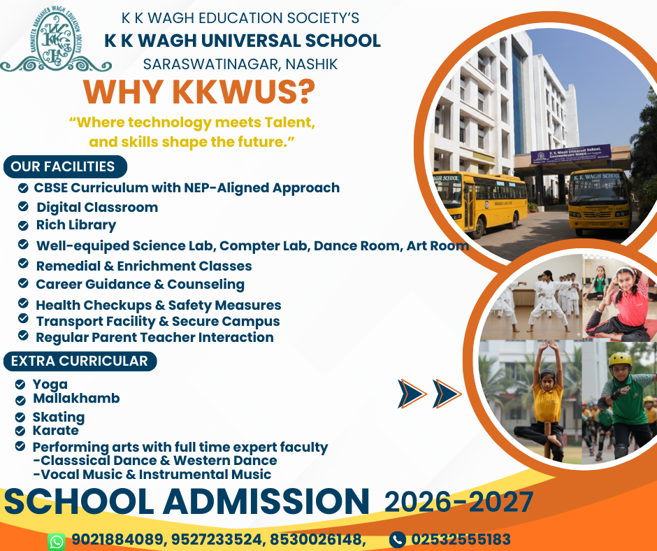 "Education is the most powerful weapon which you can use to change the world."On behalf of K.K. WAGH UNIVERSAL SCHOOL & JR. COLLEGE, SARASWATI NAGAR, NASHIK, I hereby extend a warm welcome to my founder parents and new ones. Our heartfelt gratitude to all the new parents for choosing to entrust their ward to us.The aim of this almanac is to acquaint the children with curricular,co-curricular and extra-curricular activities. We provide the right environment for child's growth because for us "The child comes first."